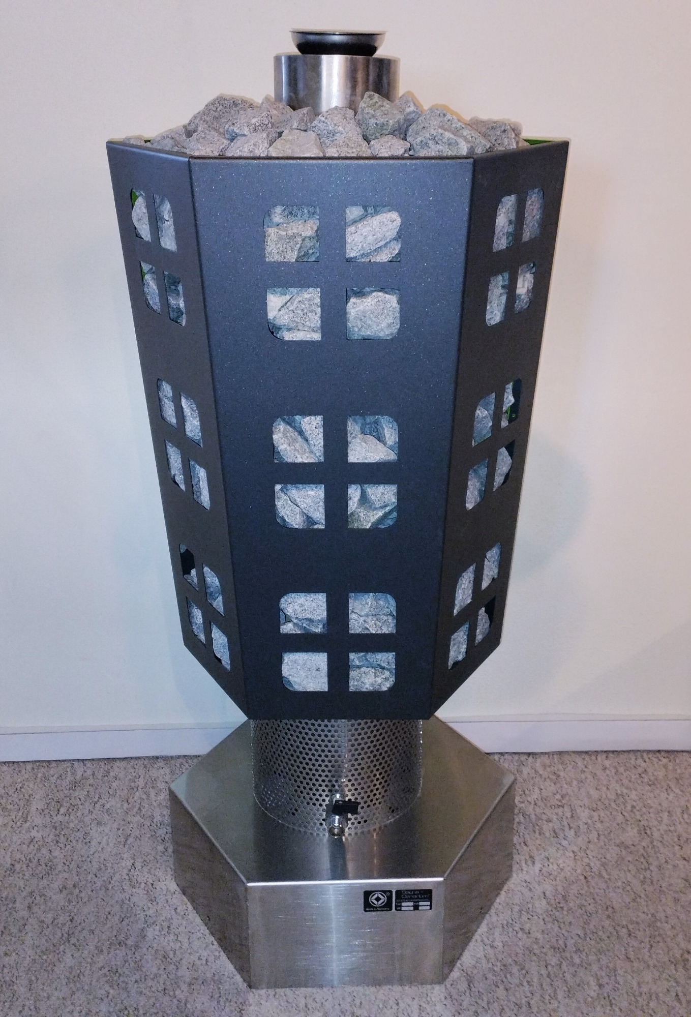 Das urige "Tower-Turm-Design mit optimaler Luftzirkulation. Ideal auch zur Aufstellung vor Glasflächen. Auffällige rustikale Erscheinung ,mit gebogenen Design Außenecken. Steinkorb in Edelstahl oder mit RAL-Farben beschichtet.Modern-uriges Aussehen. "ALL in ONE" Technik.